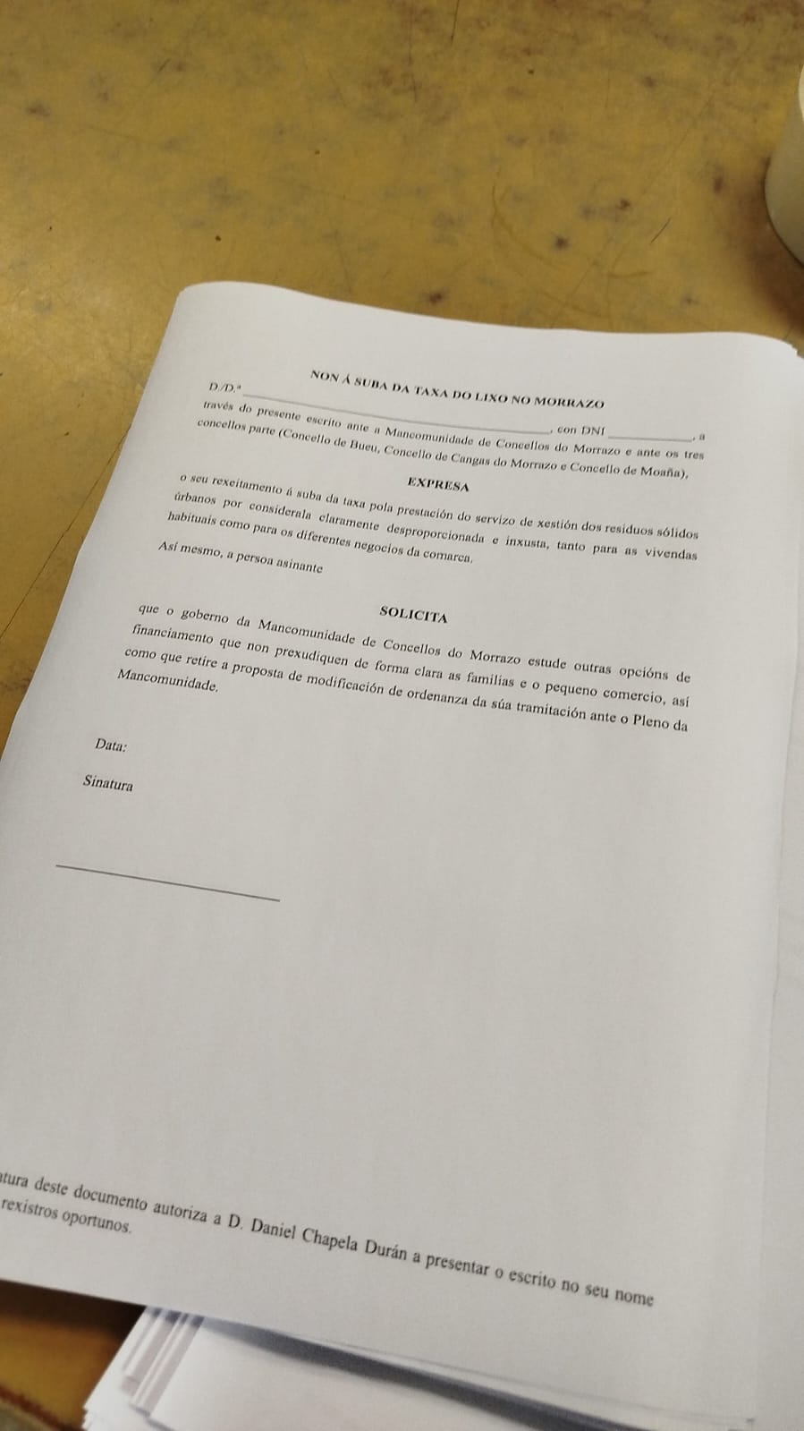 Documento repartido en los establecimientos comerciales de Bueu para firmar contra la subida de la basura.
