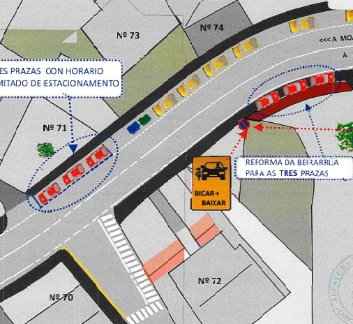 De las tres propuestas que planteó la concelleira de Educación, Dolores Chapela, la que finalmente quedó pendiente de análisis por parte de los colectivos fue la de crear un total de nueve plazas de estacionamiento repartidas en tres zonas diferentes de la carretera autonómica y situadas a pocos metros de la bajada al colegio y con espacio para tres vehículos en cada una de ellas. Una se situaría en el margen derecho de la vía a la altura del número 75 y las otras dos en sentido contrario. En ellas se podrá parar un máximo de cinco minutos exclusivamente en horario de mañana, coincidiendo con la entrada de los niños al centro, entre las 8:45 y las 9:05 horas los días laborables y durante el curso escolar. Durante esta franja horaria también se cerrará al tráfico la calle que da acceso al Ceip.
