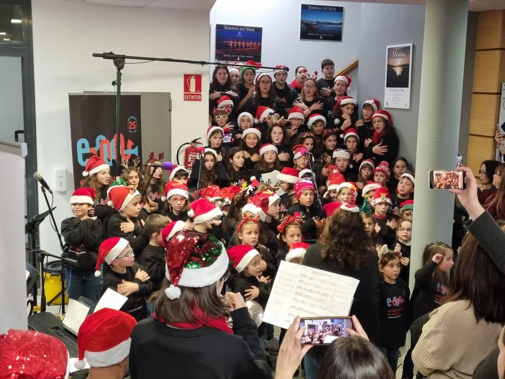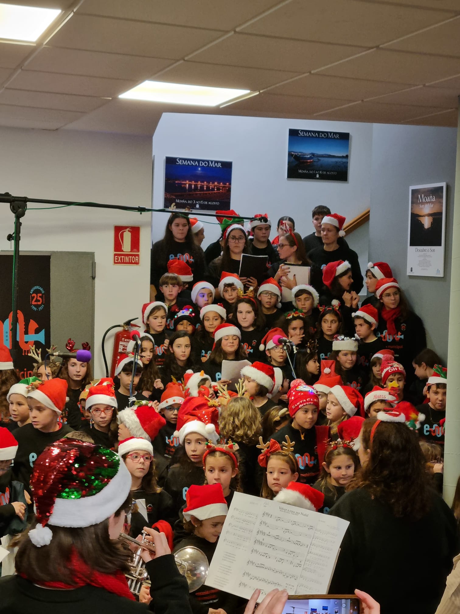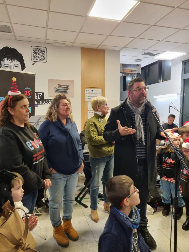 El encendido navideño ha estado marcado por la lluvia en Cangas y Moaña. Aun así, los gobiernos de ambos municipios pulsaron el botón de las luces para teñir de color el mes más mágico del año. En Moaña lo hicieron con el tradicional acto en el Concello, en este caso en el hall principal en el que no cogía ni un alfiler para ver la actuación de los alumnos de la Escola de Música.