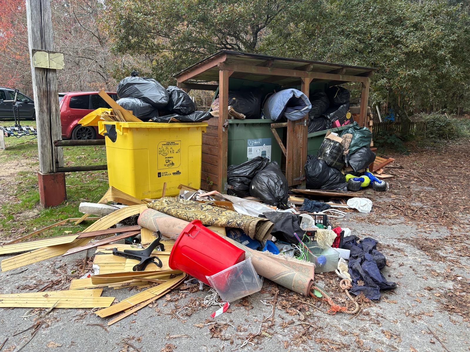 El área recreativa de Chans, en lo alto de la parroquia de Cela, en Bueu, presenta un aspecto lamentable. Al lodazal que supone toda la explanada del recinto natural se une también la suciedad y la acumulación de basura en sus accesos. Aunque es algo habitual encontrar esta estampa de dejadez, este fin de semana la isla situada en la puerta tenía todos sus contenedores a rebosar y una gran cantidad de bolsas a su alrededor, además de restos de mobiliario de alguna vivienda juguetes y un sin fin de voluminosos que ocupaban gran parte de la zona natural.