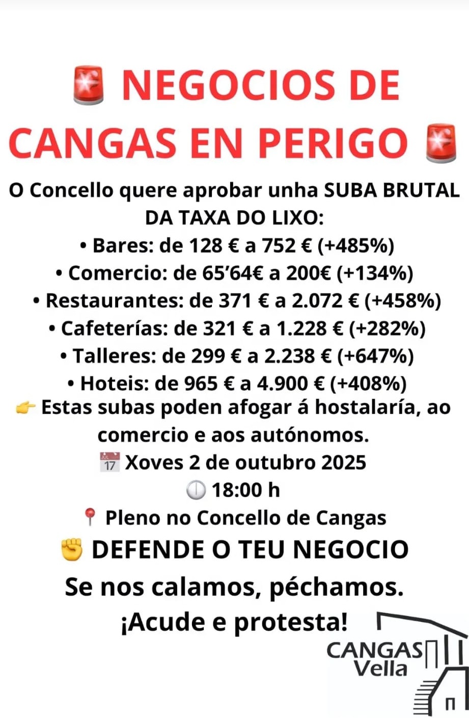 Mientras tanto, el tenido comercial e industrial de la comarca se está uniendo y organizando contra este incremento que consideran “desproporcionado y abusivo”. La Federación de Comerciantes e Industriais do Morrazo (Fecimo), que agrupa a la mayoría del comercio e industria de Cangas, Moaña y Bueu, exigió su “paralización inmediata” y en las últimas horas envió una circular a sus asociados invitándoles a estar presentes en la asamblea que se iba a realizar esta tarde en el salón de plenos del Concello cangués.