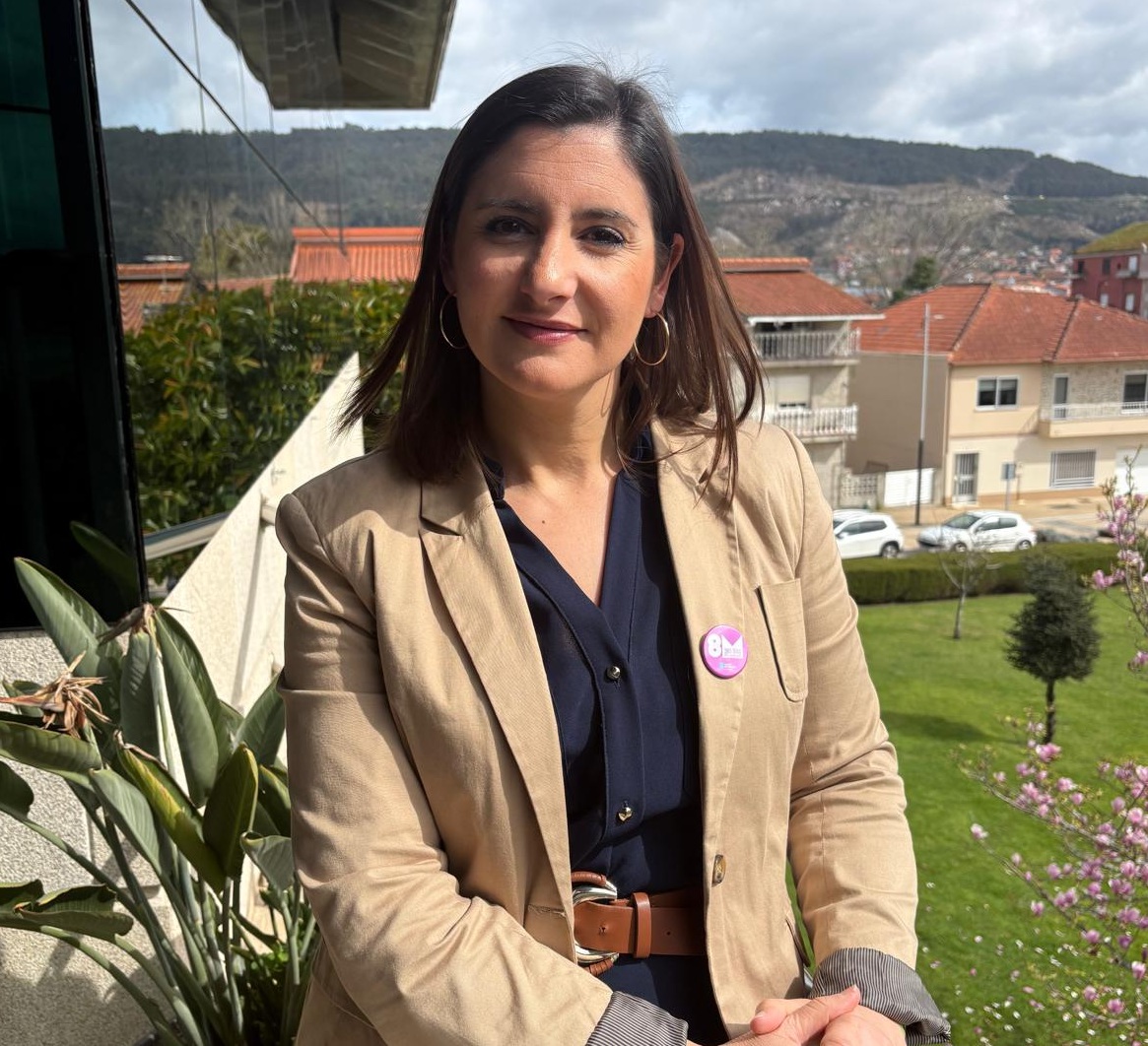 La alcaldesa de Moaña, leticia Santos, con la chapa reivindicativa del 8M.