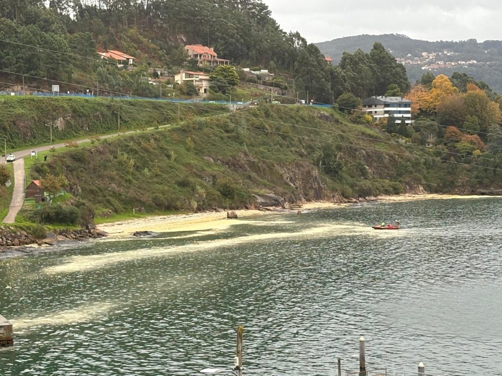 El vertido de aceite de palma que se produjo ayer en Vigo a causa de un depósito entre los muelles de Guixar y Areal llega a la playa de A Borna, en Moaña. El arenal y la lámina de agua se encuentran teñidos de color amarillento desde primera hora de la mañana.
