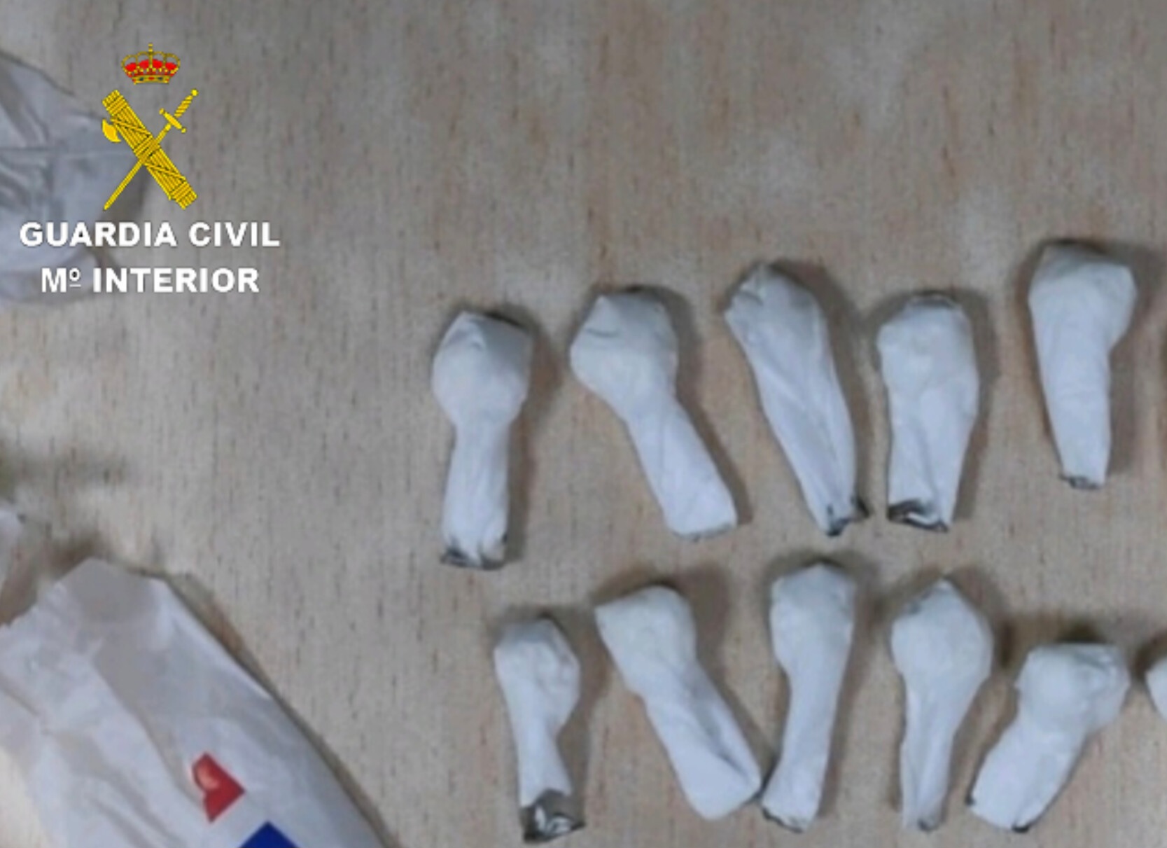 Durante el registro, se localizaron ocultos entre sus prendas de vestir un monedero que contenía 11 bolsitas plásticas con cocaína, con un peso total de 11,1 gramos, así como 9 trozos de una sustancia de color marrón, supuestamente hachís, con un peso de 34,3 gramos.