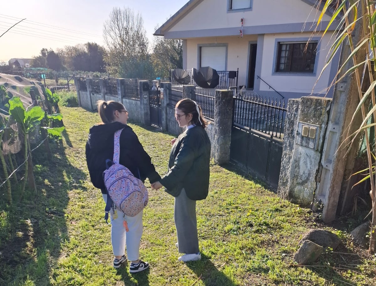 Ruth ayudando a su hermana a llegar hasta su casa por el camino público.