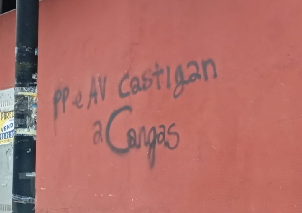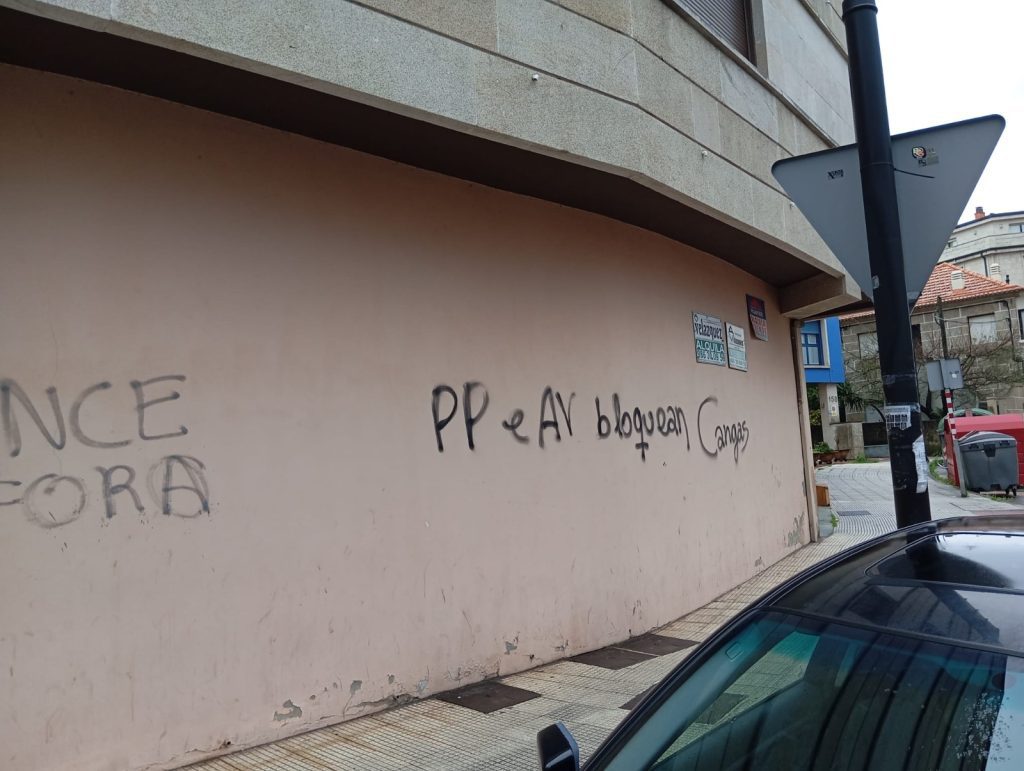 Pero lejos de ser algo aislado, ayer se localizaban nuevos escritos con un mensaje similar, aunque en esta ocasión señalaban también al principal partido de la oposición. “PP e AV castigan Cangas”, reza sobre la fachada de un edificio de la Avenida de Bueu, al igual que en la pared de otro inmueble se puede leer “PP e AV bloquean Cangas”. La tercera ‘obra de arte’ destaca sobre el fondo blanco de la sede del Club Náutico de Cangas, a pocos metros de la rotonda de Pedra Alta. Aparentemente guarda la mismas características con la de Ojea, lo que hace suponer a los agentes de la Policía Local que investigan los hechos que comparten autoría. Y, evidentemente, ideología.