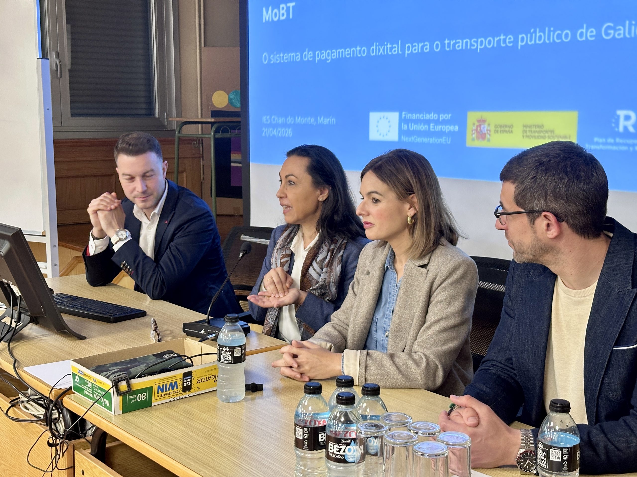 A alcaldesa de Marín, María Ramallo, participou hoxe pola mañá nunha xornada de promoción da nova Plataforma Galega de Mobilidade 4.0 MoBT no IES Chan do Monte. No evento, dirixido ao alumnado, tamén estiveron presentes a directora xeral de Mobilidade, Judit Fontela, e o director da Axencia para a Modernización Tecnolóxica de Galicia (Amtega), Damián Rey.