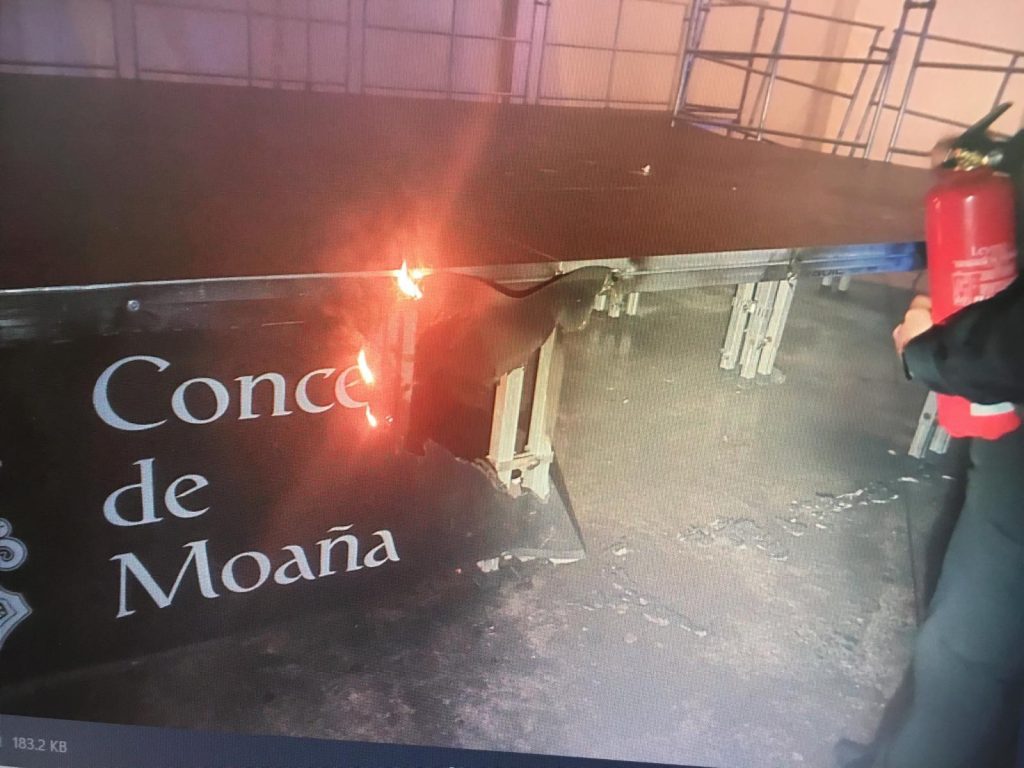 Pero no sería el único de la madrugada. Pocos minutos después, los agentes también observaron que salía humo del entorno de la carpa instalada frente a la plaza de abastos. Al acercarse comprobaron que se trataba de un letrero en el que figuraba el escudo del Concello instalado en el interior, bajo al escenario.