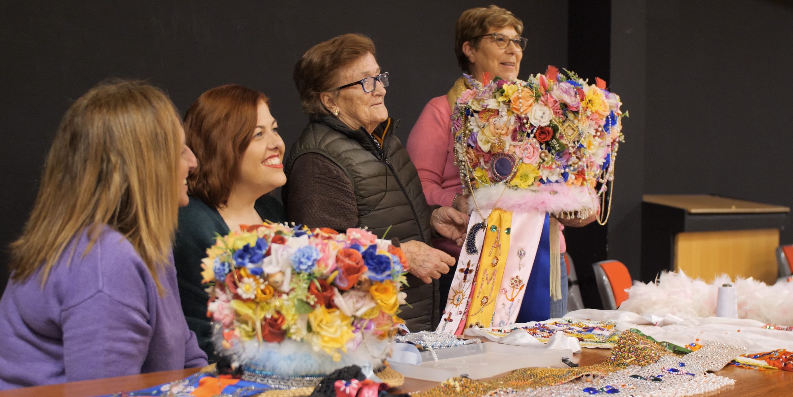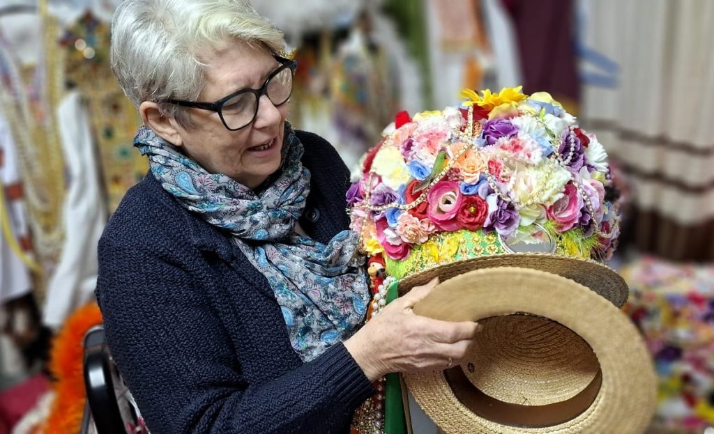 As costureiras son a man invisible que sostén o esplendor do Entroido, artesás capaces de transformar materiais humildes en pezas que abraian. No silencio das súas casas, entre teas que se estenden, puntillas que se escollen con mimo e centos de abelorios cosidos un a un, dan vida a traxes que requiren unha precisión extrema e unha dedicación que non se pode medir en horas. O seu labor abrangue tamén a creación dos vistosos sombreiros, auténticas arquitecturas de equilibrio e detalle, onde cada flor, cada pluma e cada brillo se coloca coa mesma paciencia que se herda de xeración en xeración. En cada madama e en cada galán vai a súa mirada, o seu coidado e a súa memoria. Grazas a elas, o Entroido non só se ve: respírase, emociona e permanece. Mari Carmen Docampo Solla, Carmen Cortegoso González, Aurita Palmeiro e María del Carmen Poceiro Buceta son parte esencial deste legado vivo, mulleres que co seu talento manteñen aceso o fío que une tradición e arte.